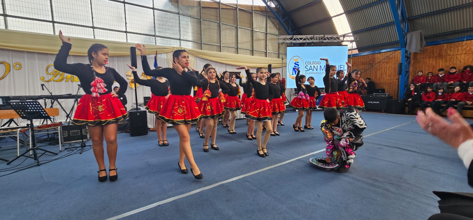 El acto continuó con la presentación de la academia de folclor de primer ciclo, dirigida por las profesoras Valeria Lobos y Daniela Yáñez, quienes junto a sus estudiantes ofrecieron una fantasía musical basada en la tradicional cumbia “La pollera colorá”. En representación de todos los estudiantes, los alumnos Kilian Yáñez de primero básico B y María Villasanti de octavo básico B compartieron un afectuoso saludo de aniversario, destacando el orgullo de pertenecer a nuestra comunidad.