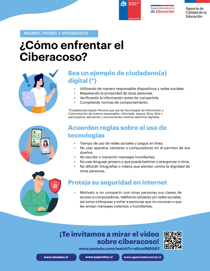 El Ministerio de Educación ha instaurado el Día contra el Ciberacoso, invitando a los establecimientos educacionales de todo el país a conmemorar y participar en este día 13 de Marzo. En las siguientes imágenes y video de apoyo, se explica que es el ciberacoso, como se expresa y la forma en que debemos enfrentar este tema importante, donde debemos tomar conciencia sobre el desafío que implica las relaciones digitales.